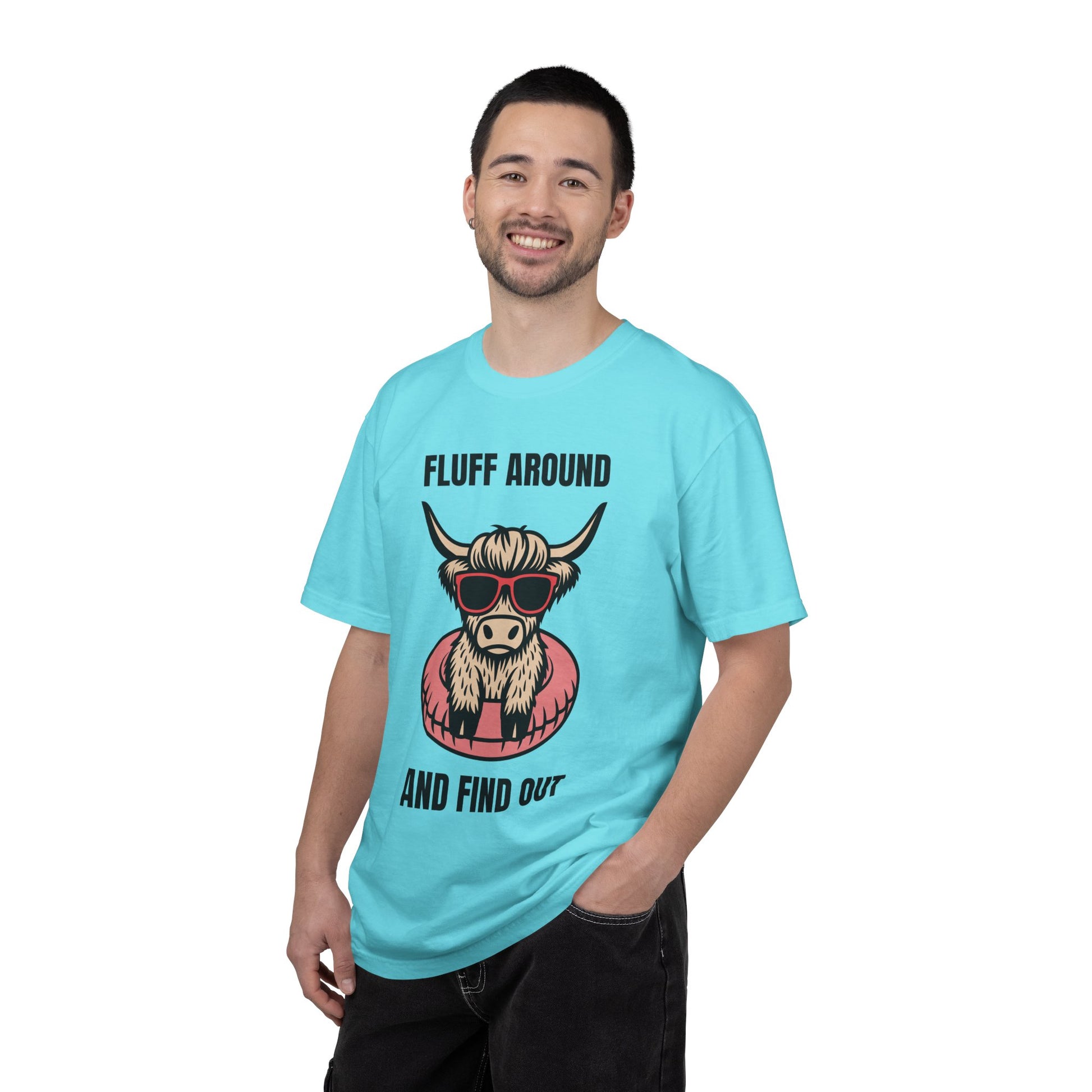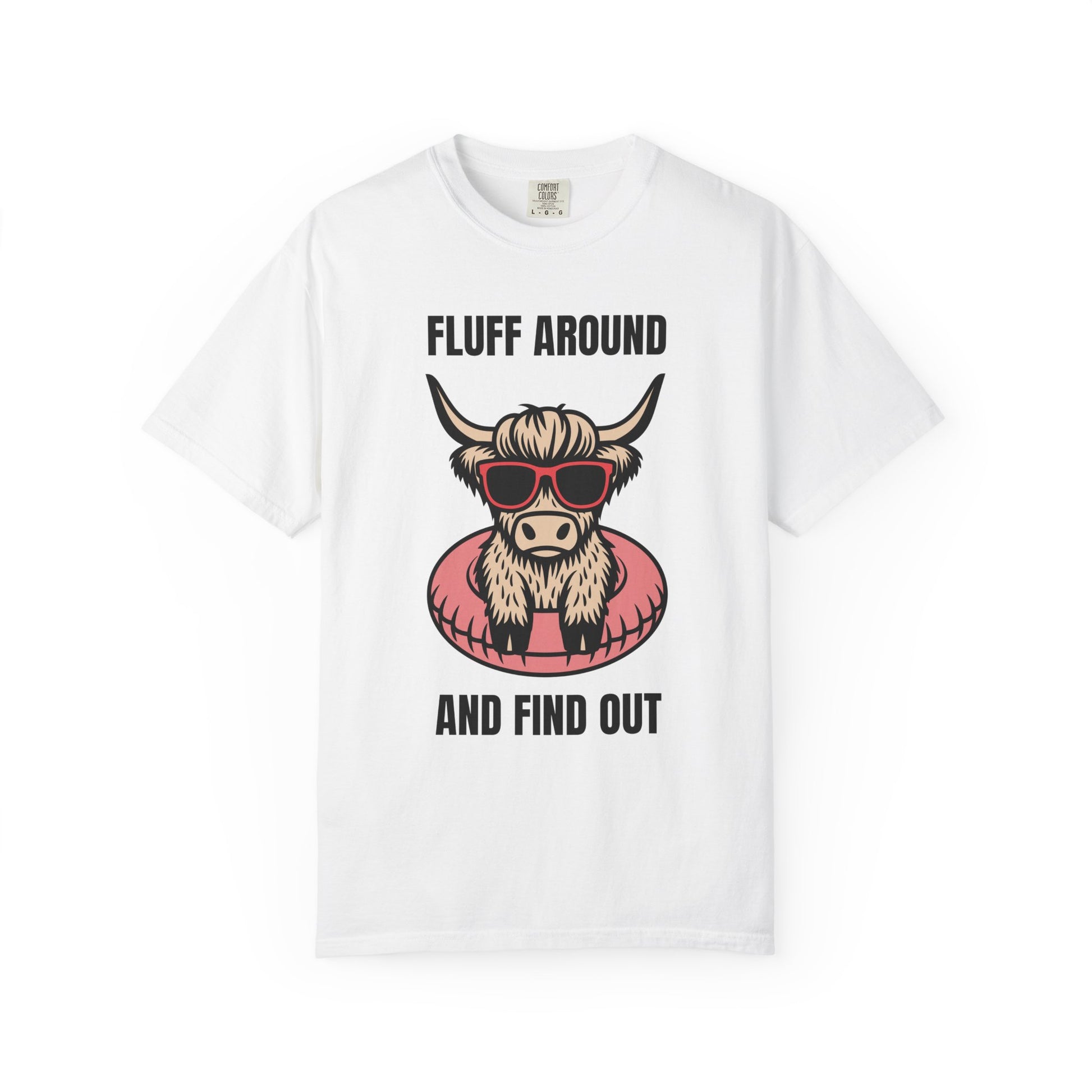 Lightweight but sturdy, this garment-dyed tee carries a playful attitude: a sunglasses-wearing highland cow floating in a donut tube, captioned “FLUFF AROUND AND FIND OUT.” The relaxed silhouette and soft, broken-in color from post-construction dyeing make it feel lived-in from day one. Wear it to backyard barbecues, lazy lake days, or when you want to keep things cheeky on a casual coffee run. The heavyweight cotton holds the print crisply while the tubular knit and double-needle seams give it lasting shape—this shirt becomes one of those go-to pieces you reach for when you want comfort and a little personality.